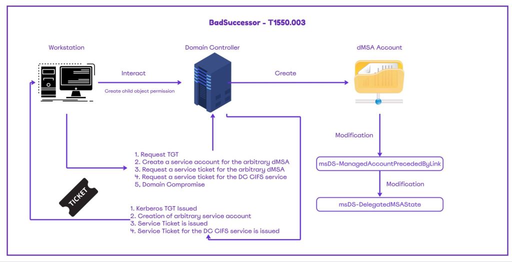 The attribute msDS-DelegatedMSAState is set to 2 to simulate that the migration has been completed (i.e. arbitrary dMSA linked to Domain Administrator). The threat actor then attempts to obtain a Kerberos Ticket Granting Ticket (TGT) for the current account. Utilizing the generated ticket, it is feasible to create a service and request from Kerberos a service ticket (TGS). Since the permissions are delegated to the arbitrary service account, due to the attributed modification of msDS-ManagedAccountPrecededByLink, it is possible to request a service ticket for any service within the domain such as the Common Internet File System (CIFS) of the domain controller. The CIFS service ticket could be used by the threat actor to access domain controller resources and effectively compromise the domain. The following diagram visualize the technique of BadSuccessor.