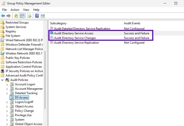 Computer Configuration > Policies > Windows Settings > Security Settings > Advanced Audit Policy Configuration > Audit Policies > DS Access