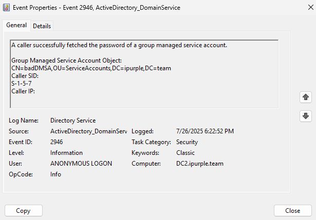 Furthermore, when a Ticket Granting Ticket (TGT) is generated for the dMSA account, the domain controller captures the activity in the Directory Service logs under the Event ID 2946.