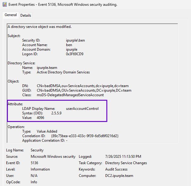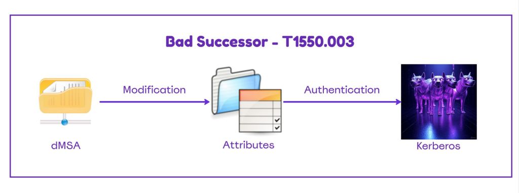 The attribute msDS-ManagedAccountPrecededByLink was introduced in Windows Server 2025 as part of the delegated Managed Service Account. The purpose of this attribute is to link a dMSA to a legacy service account that is intended to replace. The Key Distribution Center (KDC) uses this attribute to identify which account the dMSA is inheriting privileges from during authentication. The threat actor modifies this attribute to point to a privileged account (i.e. Domain Administrator).