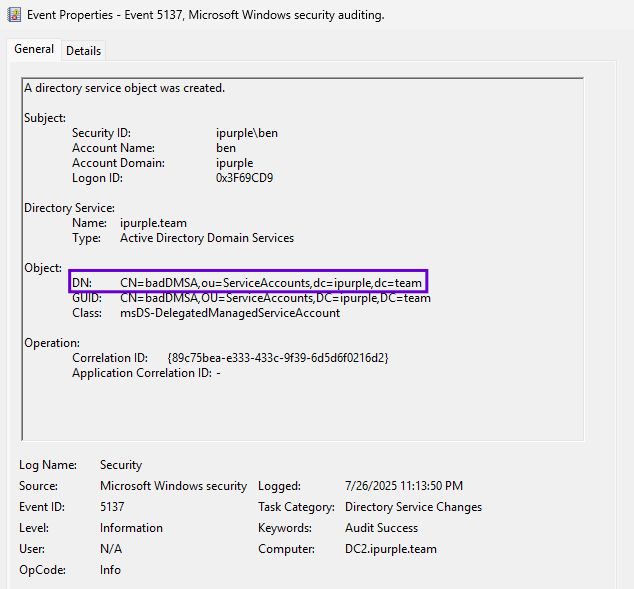 The Windows Event ID 5137 captures the creation of directory service objects. Defensive teams can capture the arbitrary dMSA account in the DN field under the object: