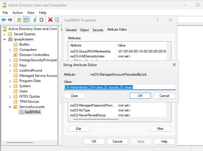 - Set the msDS-ManagedAccountPrecededByLink to the DN of the Administrator user