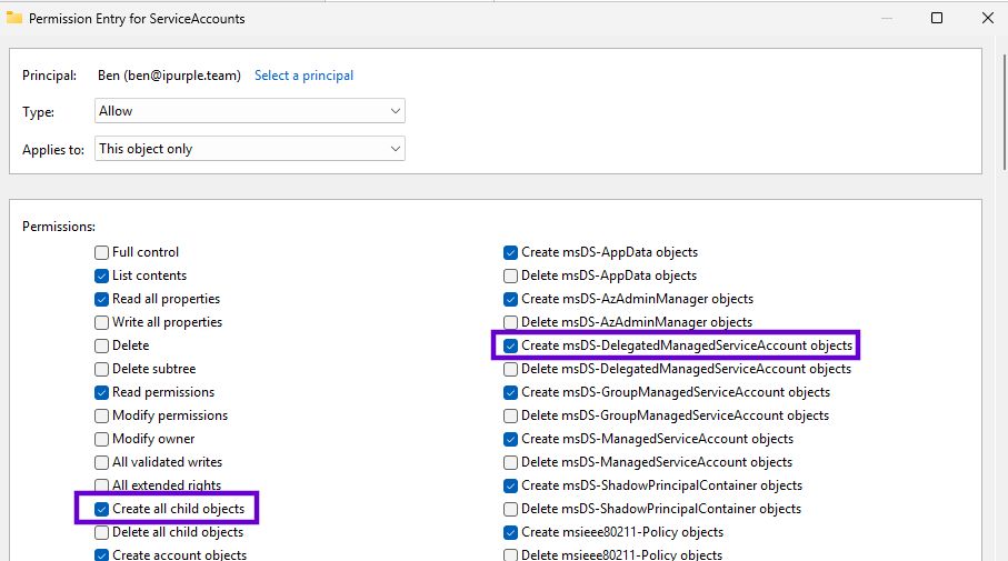 The following screenshot demonstrates a user in the domain (Ben) that has the Create all child objects permissions over the organisational unit ServiceAccounts.