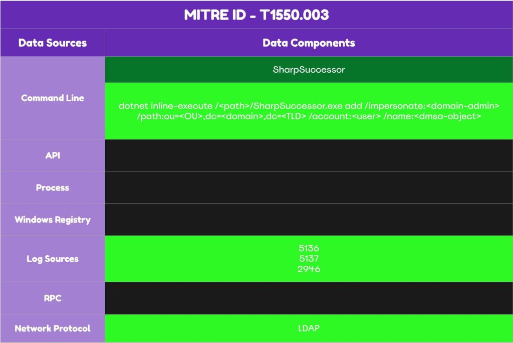 Logan Goins has released a proof of concept in .NET, called SharpSuccessor to implement the BadSuccessor technique. The tool can simulate the migration of delegated managed service accounts by creating a new object under the organizational unit (OU) which the user has write permissions and by modifying the associated attributes. Execution of the following command will perform the following activities on the domain controller: