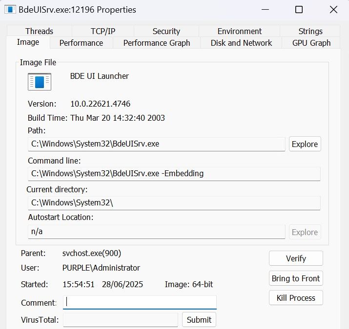 The BdeUISrv.exe process remains active on the system as opposed to the process vulnerable to COM hijacking BaaUpdate.exe that is terminated. It should be noted that the process BdeUISrv.exe was executed under the context of the Administrator user, which was the user that had the interactive session on the host and was targeted.