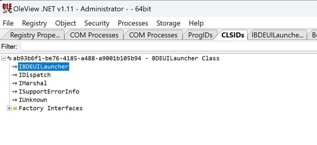 The CLSID ab93b6f1-be76-4185-a488-a9001b105b94 spawns four different processes as the Interactive User. One of these processes is the BaaUpdate.exe, which is vulnerable to COM hijacking.