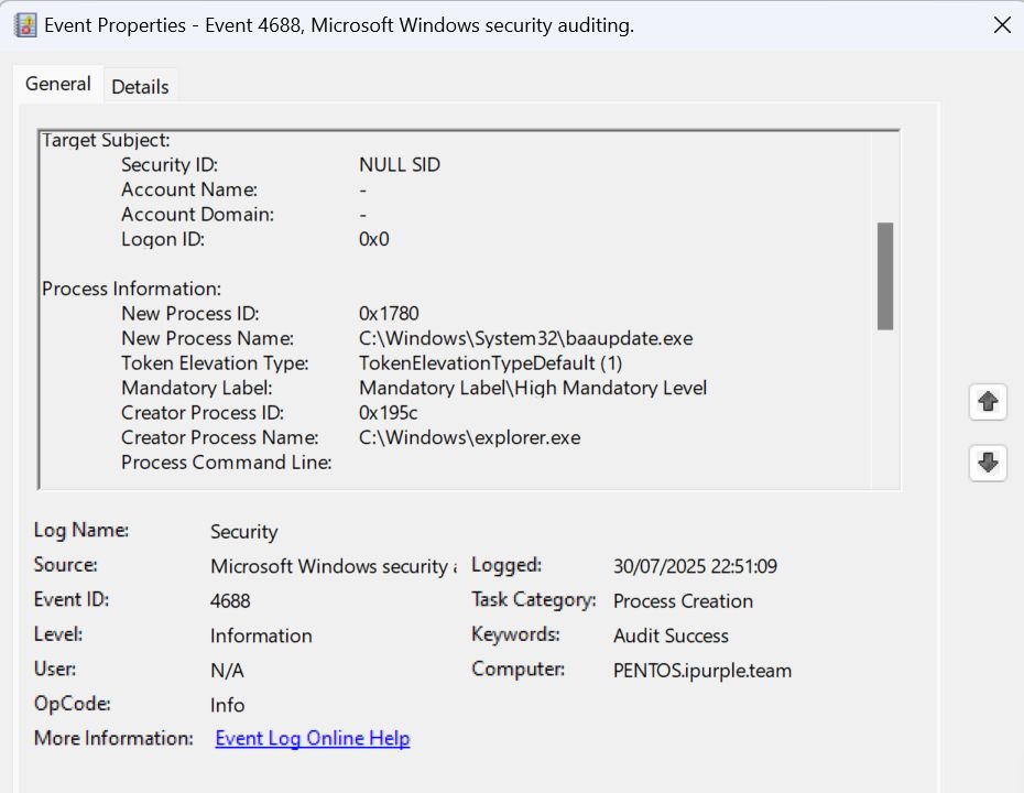 The last stage of the technique is to trigger the process vulnerable to COM Hijacking (baaupdate.exe) to execute. Auditing process creation events as an additional data source would generate a significant volume of logs. Organisations should assess whether this additional logging should be enabled based on their storage capacity and risk appetite to enable this data source. Process creation events are associated with the event ID 4688 and auditing could be enabled from the following location: