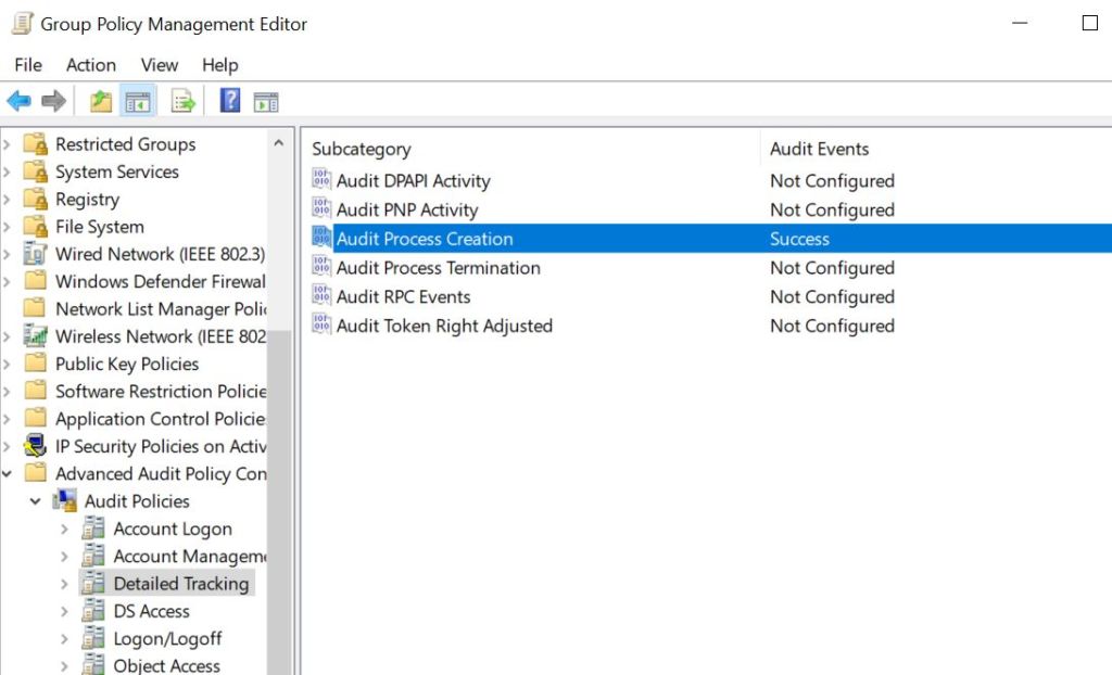 Computer Configuration > Policies > Windows Settings > Security Settings > Advanced Audit Policy Configuration > Audit Policies > Detailed Tracking > Audit Process Creation
