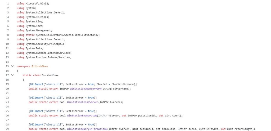 The tool BitLockMove simulates the behavior of lateral movement via BitLocker. For the remote session enumeration component, the tool relies on undocumented Microsoft API’s that are part of the winsta.dll library. The DLL is associated with a binary that is part of the Windows ecosystem called qwinsta and has the ability to display information about sessions on a remote desktop.