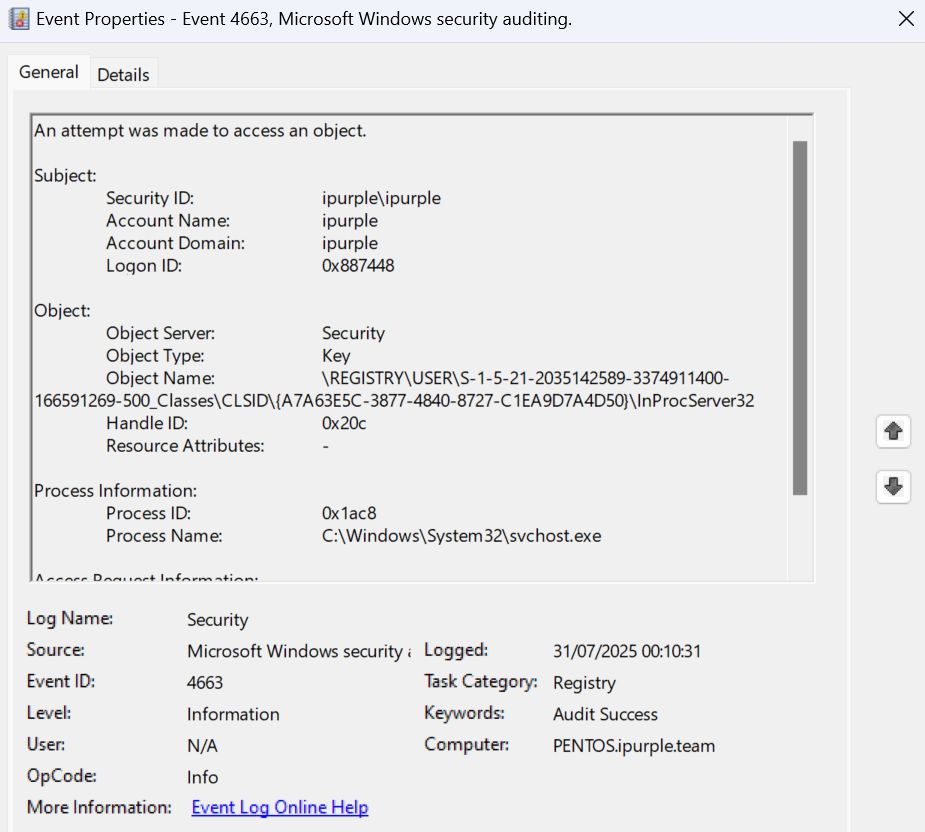 ObjectName|contains: 'HKEY_CURRENT_USER\SOFTWARE\Classes\CLSID\{A7A63E5C-3877-4840-8727-C1EA9D7A4D50}'