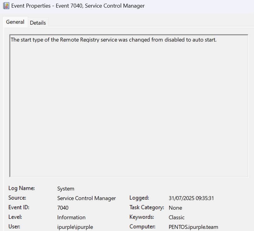 Information captured in the user field could lead an incident response investigation to other systems which the account has access and classification of these systems as compromised. Enabled and Disabled a service in a very short timeframe should be flagged as abnormal activity. The following SIGMA rule can detect changes to the status of the Remote Registry service.