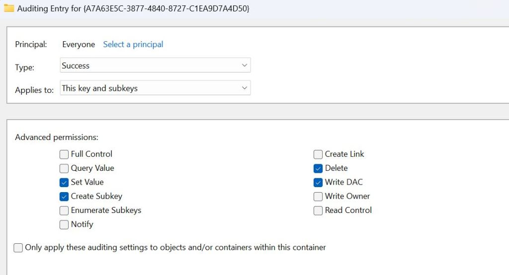 To enable monitoring of this key, auditing of the advanced permissions SetValue, Create Subkey, Delete and Write DAC is required under the principal group Everyone.