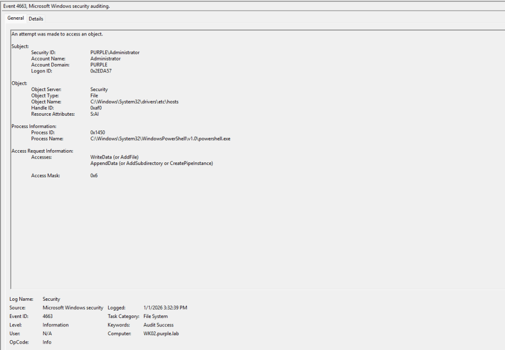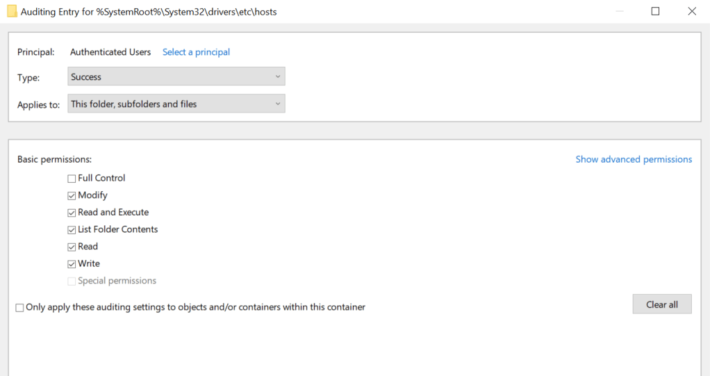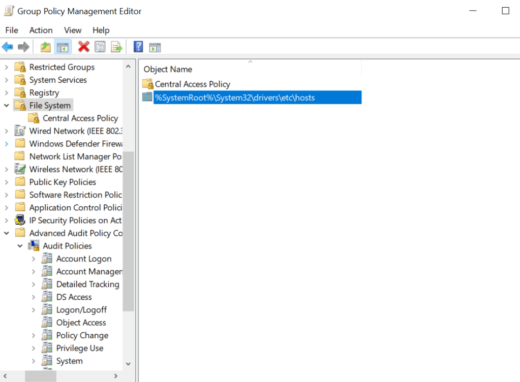 An alternative method to restrict EDR outbound communication is via modification of the hosts file. Identification of any changes in the etc\hosts file requires enabling auditing for File System and Handle Manipulation.