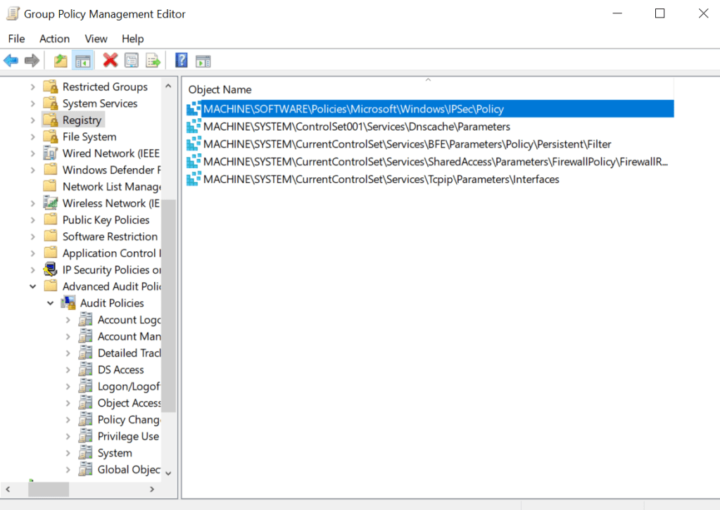 Computer Configuration > Windows Settings > Security Settings > Advanced Audit Policy Configuration > Audit Policies > Policy Change > Audit Filtering Platform Policy Change
