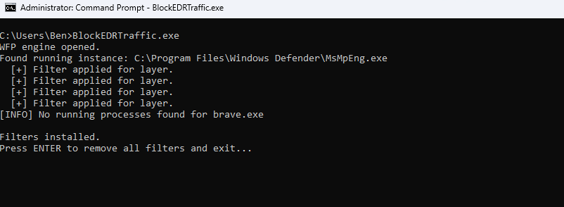 A similar proof of concept that uses the same API’s was released at the bordergate website. The code below searches for processes that match the target executable names (brave, MsMpeng etc.) and uses the QueryProcessImageW API to obtain the full image path. The AddFilterForLayer function is utilised to create a new filter and calls the FwpmFilterAdd0 to add the rules that will block the EDR agent communication. It should be noted that the code below doesn’t introduce a new method, and it has the same behavior as the EDRSilencer. Therefore, the same detection opportunities remain applicable.