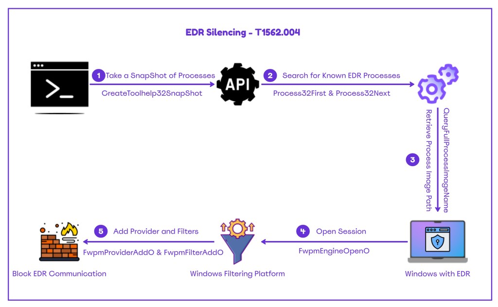 The diagram below demonstrates how the EDR Silencer tool operates under the hood to block EDR communication.