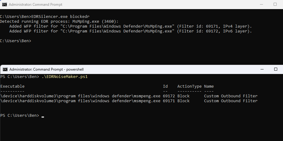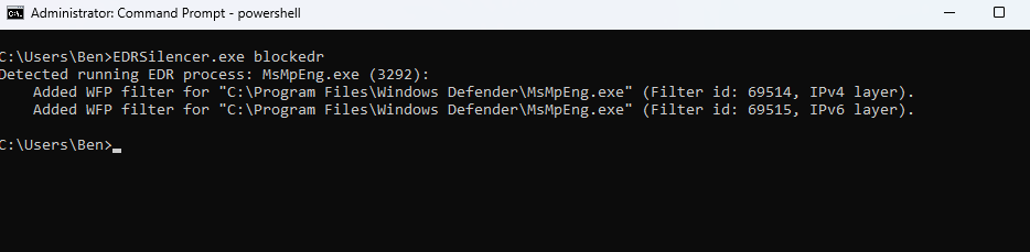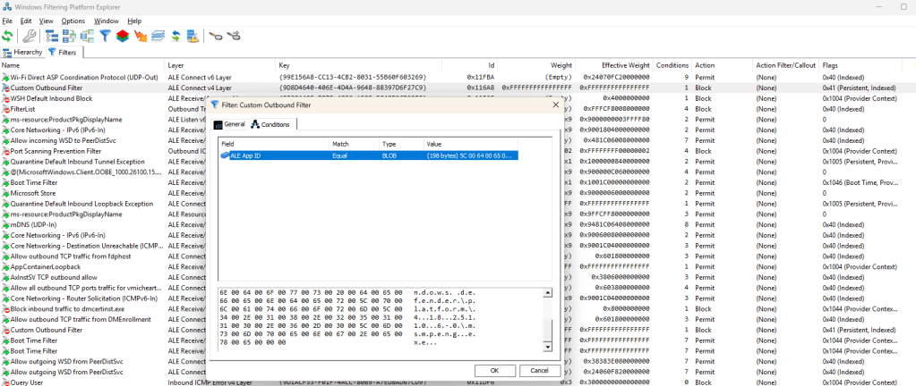 Chris Au released a proof of concept in C, called EDRSilencer that leverages a specific set of API’s to interact with the Windows Filtering Platform and apply rules that would prevent an EDR agent to make an outbound connection to its cloud management console. Specifically, the tool uses the FwpmFilterAdd0 API to add a WFP filter: