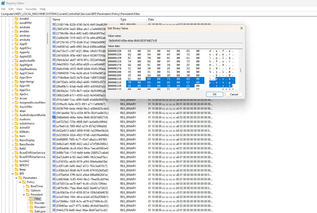 HKEY_LOCAL_MACHINE\SYSTEM\CurrentControlSet\Services\BFE\Parameters\Policy\Persistent\Filter