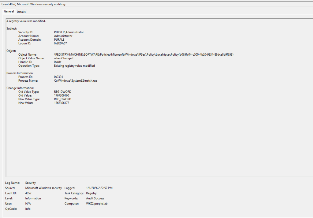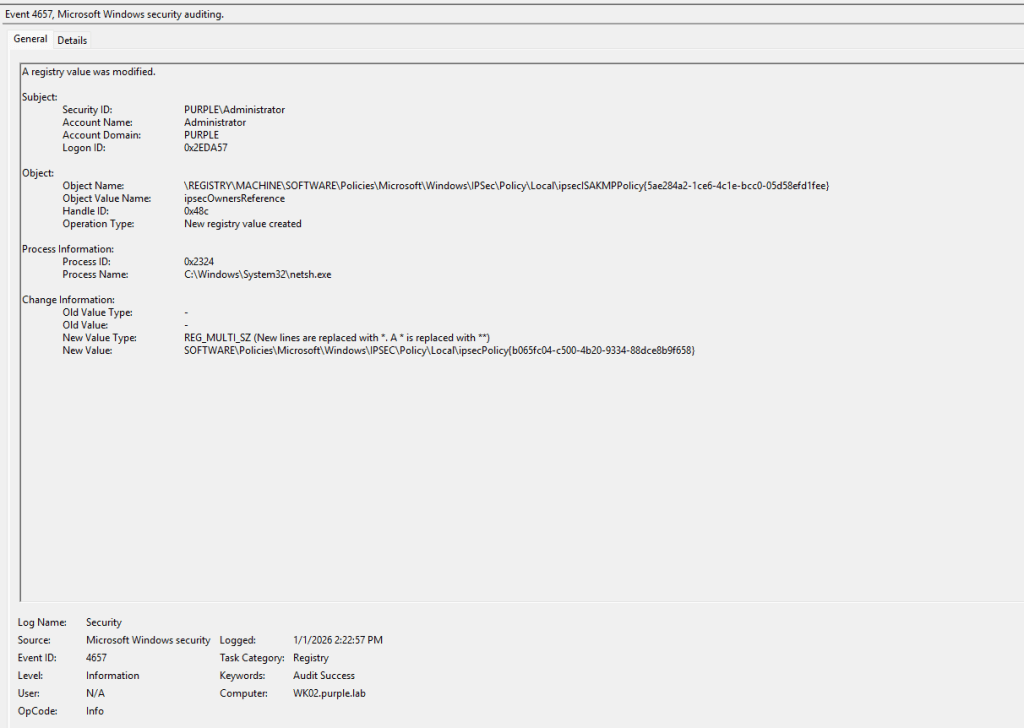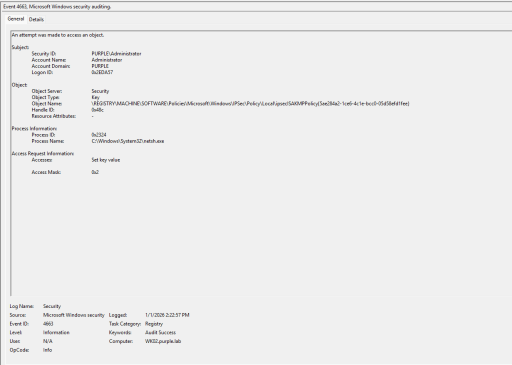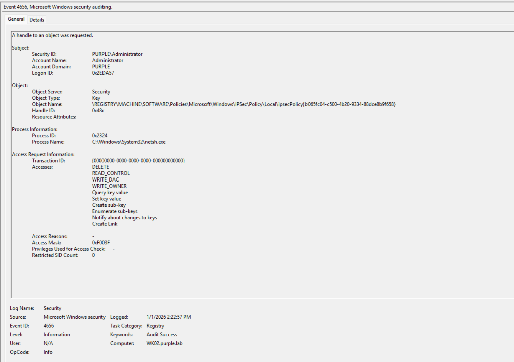 Threat actors that could leverage IPSec filters to restrict EDR outbound traffic will generate a sequence of windows events. Attempts to access and modify the IPSec registry key from the netsh process should be considered arbitrary. Furthermore, the creation of new IPSec policies could be captured under Windows Event ID 5460 and 5471. It is recommended to correlate these actions with the registry key events that target IPSec policies. The table below associates the actions of this procedure with the windows event ID’s.