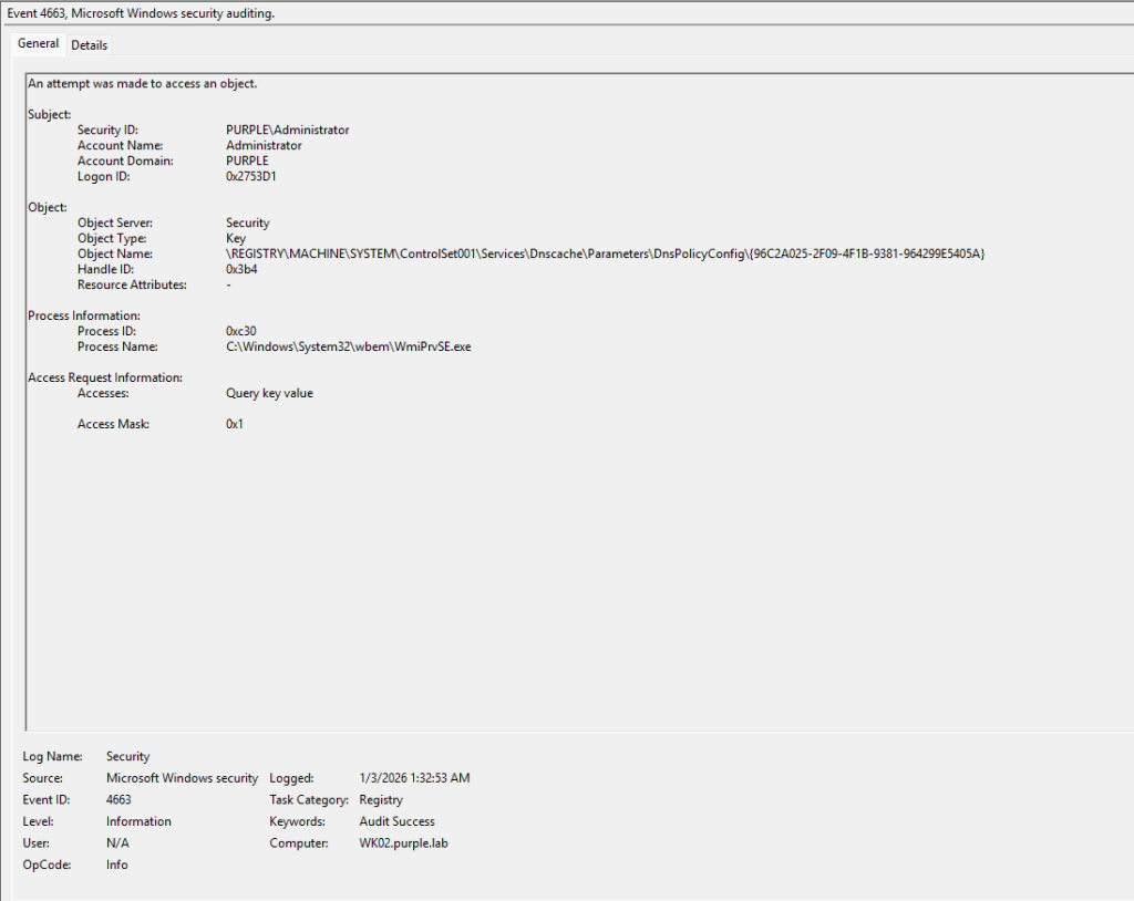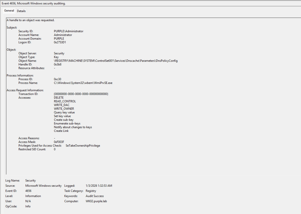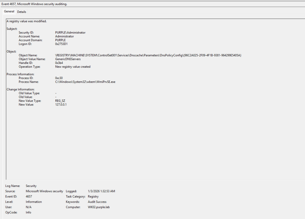 Even though the Add-DnsClientNrptRule is not a WMI cmdlet, it interacts internally with WMI to query DNS client configuration and to check the state of the Name Resolution Policy Table. This will cause changes to the NRPT to appear from the process WmiPrvSE.exe. Modifications to the Name Resolution Policy Table will generate the following events: