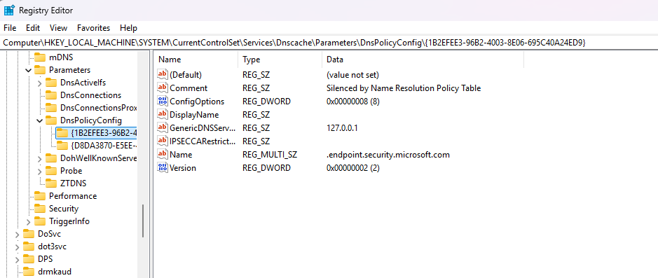 The Name Resolution Policy Table could also be abused by threat actors to bind EDR domains to non-legitimate hosts. Records to the Name Resolution Policy Table could be added via a PowerShell cmdlet. Endpoint Detection and Response technologies can capture command line arguments so detection should be trivial. It should be noted that the entries to the Name Resolution Policy Table are stored in the following registry key: