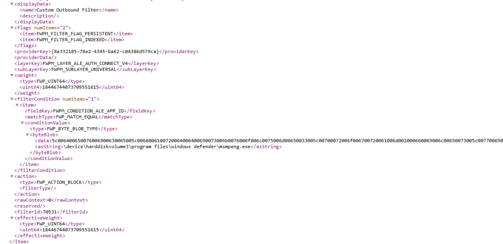 Windows Filtering Platform filters are stored in the registry. SOC teams should investigate the GUID values to identify rules associated with the EDR process during incident response. Monitoring the key that stores the filter is recommended to identify new additions.