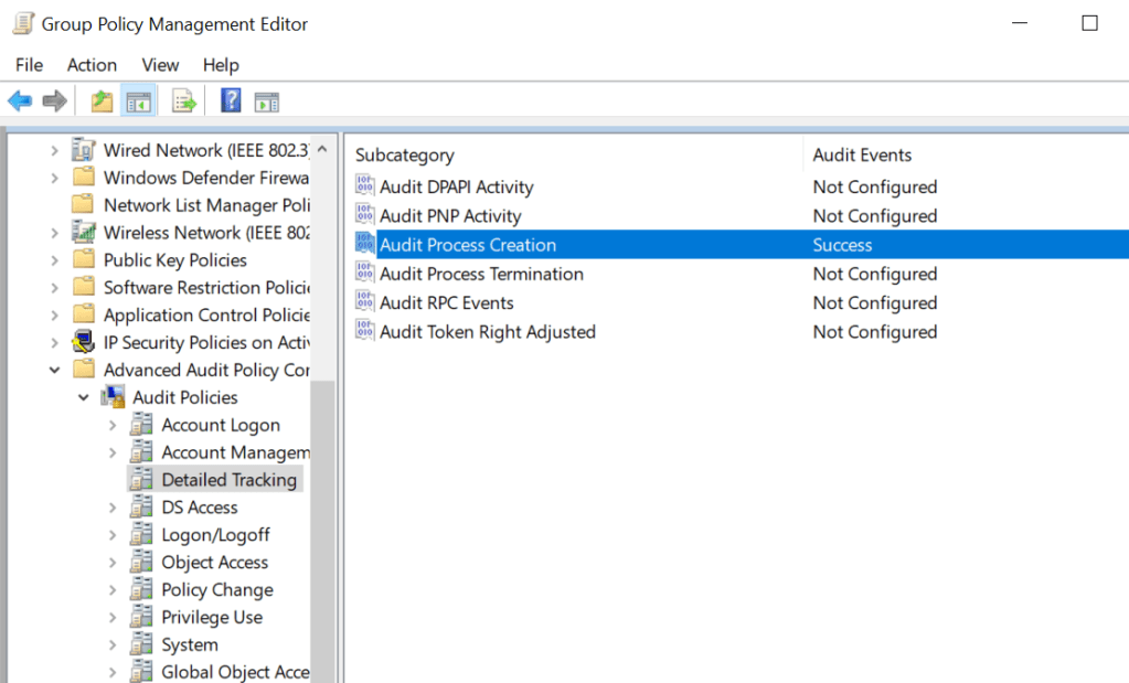 Computer Configuration > Policies > Windows Settings > Security Settings > Advanced Audit Policy Configuration > Audit Policies > Detailed Tracking > Audit Process Creation