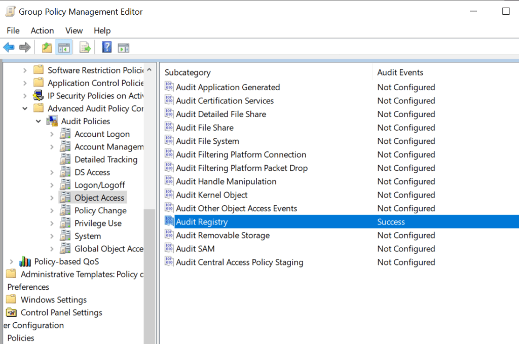 The audit registry container should be set to Success to enable registry events to be captured under Windows Event Logs.