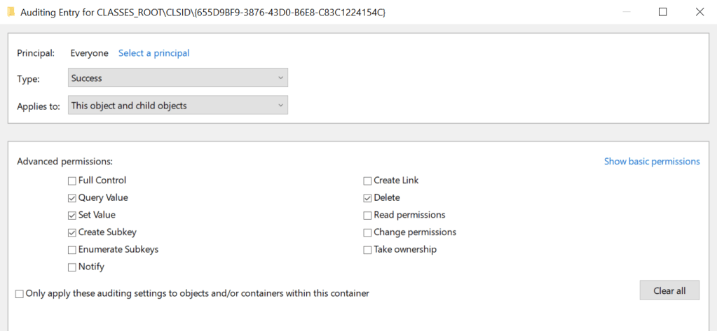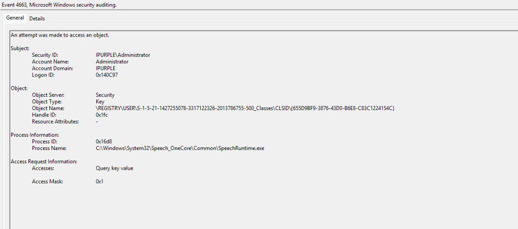 SOC teams should enable auditing of this key for the advanced permissions: SetValue, Create Subkey, Delete and Write DAC under the principal group Everyone or Authenticated Users. From the registry container within the group policy the SpeechRuntime CLSID should be added to enable monitoring of registry events.