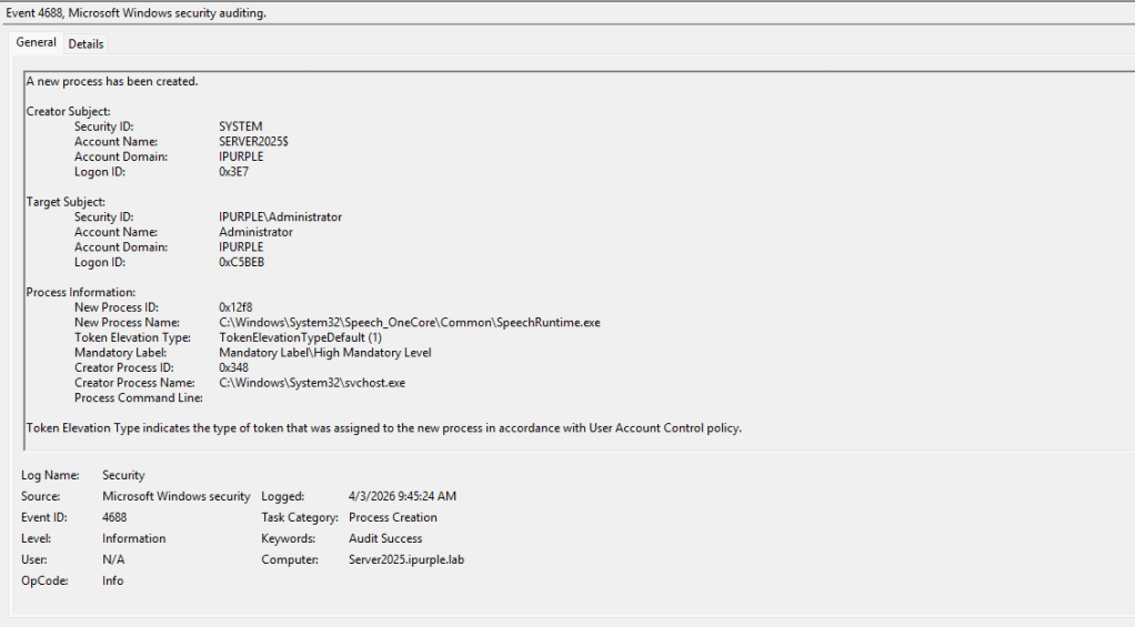 Process creation events are associated with Event ID 4688 and upon execution of the lateral movement technique via SpeechRuntime, two processes will be initiated on the system: